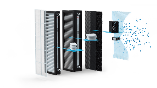 Эффективная очистка воздуха обеспечивается 5-ступенчатой системой фильтрации, которая препятствует проникновению в помещение неприятного запаха и задерживает мельчайшие частицы пыли и аллергенов, очищая воздух до 99,5%.